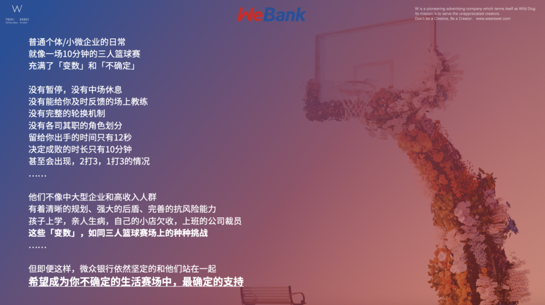 因為W野狗團隊敏銳洞察到,這個賽場之上的比賽,也時時在我們的生活中發生著。微眾銀行所服務的「小微企業、普羅大眾」,這些真實的小微市場主體往往需要獨立面對各種挑戰,置身充滿各種變數的不確定性中,卻要時刻依靠自己去規避和抵抗風險。當我們調轉視角,會發現在三人籃球的賽場之外,無數小微企業主與普羅大眾,同樣在另一個叫「生活的半場」上奮力拼搏。