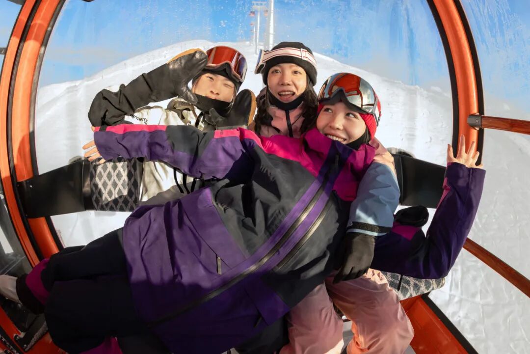 多彩设计的拼色硬壳与雪山在一起就十分美好,专业选手们暴露了“可爱”的一面。