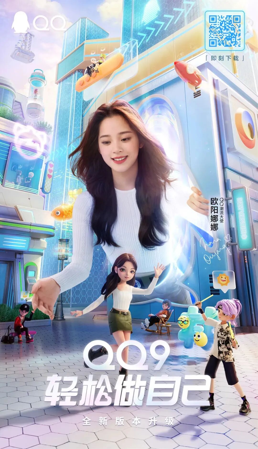 在本次TVC故事的講述上,W洞察,如今社會壓力越来越重,當我们想要和朋友們聚會時,總會因為狀況百出的問題而取消,通過「歐陽娜娜穿越手機,召喚朋友與自己在QQ9中開了場演唱會」傳達在QQ9的遊樂園裡,每個人都可以#輕鬆做自己#。